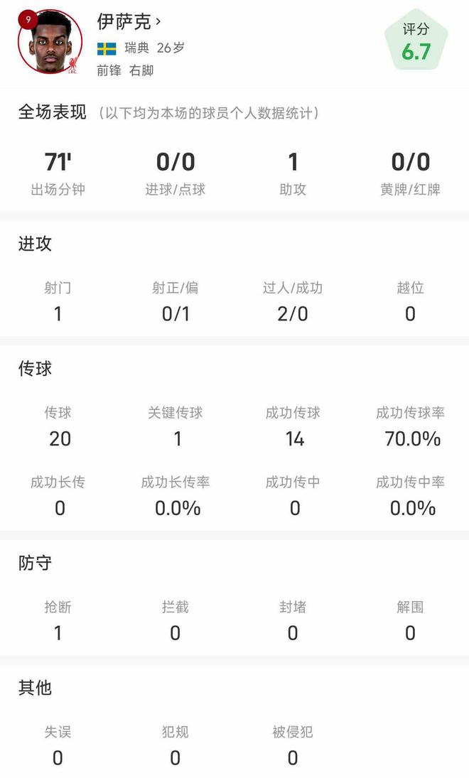 伊萨克数据:上场71分钟送出1次助攻,1次射门未能进球