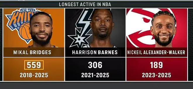 - NBA | 现役连续出勤纪录!布里奇斯连续出战559场断层领先
