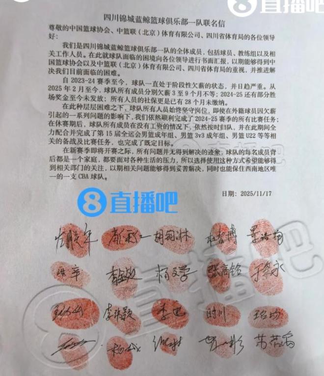 重磅:四川男篮联名讨薪引发热议:全运会为何一掷千金文/姜诗华怪事年年有,今年特别多,以往在中国足坛才经常发生的球员联名讨薪,如今在中国篮坛也出现了。北京时间11月19日上午,体育媒体曝出惊人消息:四川男篮球员、教练、工作人员日前向篮协、CBA公司、四川省体育局发布联名信,请求解决四川男篮的欠薪问题。消息一出,瞬间引发网友热议。联名信中,四川男篮全体成员表示他们遭遇欠薪3至9个月不等,且有部分奖金未发放,社保更是有28个月未交!联名信的最后有四川所有队员的签名和红手印。截止到目前为止,四川俱乐部,四川体育局和篮协以及CBA公司,尚未对此事进行回应。