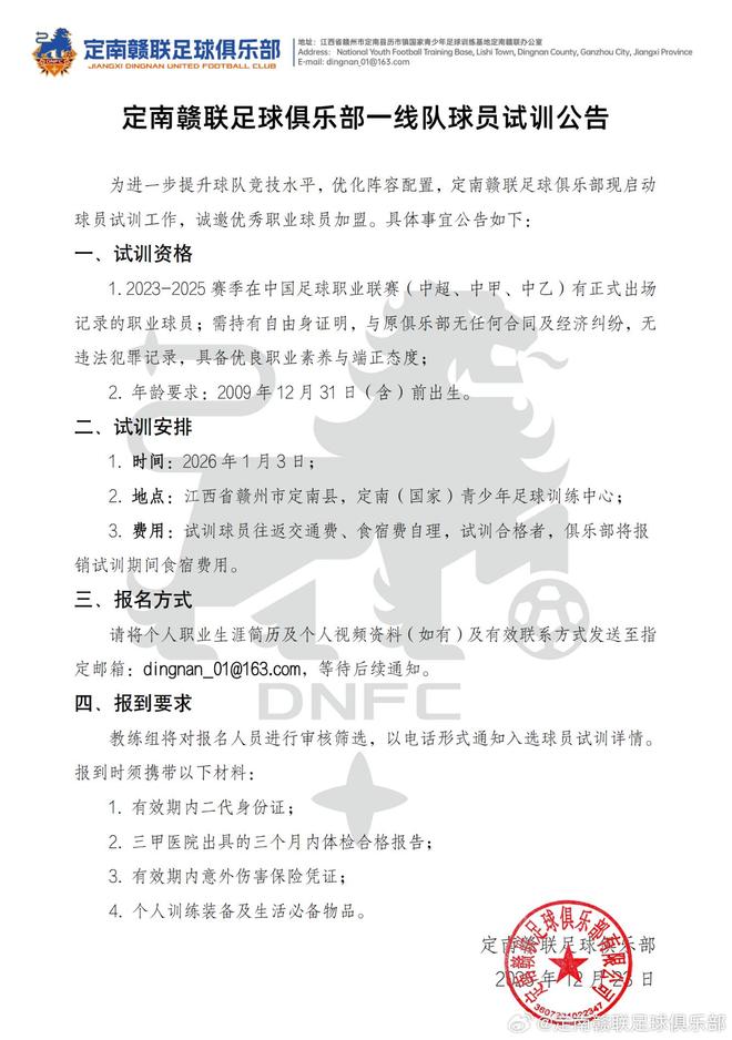 另外,和大多数俱乐部一样,定南赣联也要求试训球员需持有自由身证明,与原俱乐部无任何合同及经济纠纷。