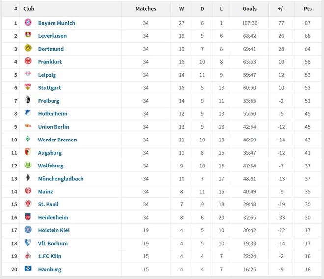 - 德甲 | 德甲2025年度积分榜:拜仁34场仅1负打进107球,领先第二21分