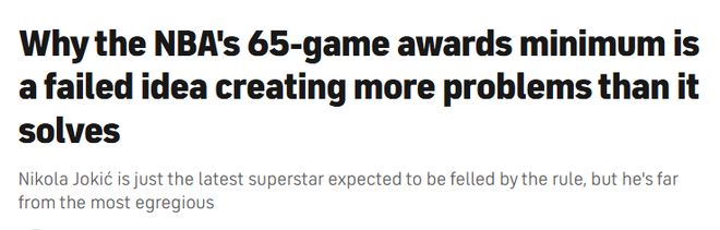 然而,NBA却偏偏出台了这样一条规则。2023年,NBA正式设立了65场出勤门槛,球员必须满足这一条件才有资格角逐主要的赛季末奖项。即便没有这条规则,约基奇的伤势几乎也注定让他无缘MVP之争,但他的缺阵场次恰好可能超过资格线,这一情况让这条本就毫无实际意义的规则引发了广泛关注。历史早已告诉我们,长期缺阵的球员很少能赢得奖项。