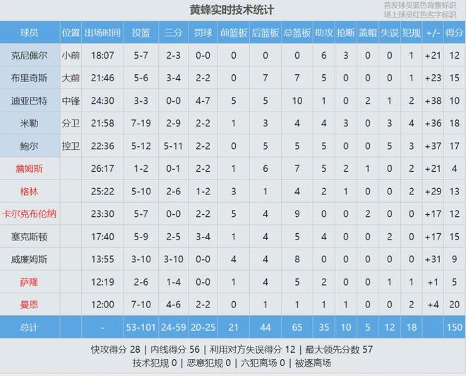 单场150分是黄蜂队史第二高分,队史最高分是158分。单场净胜55分,是黄蜂队史最大赢球分差。黄蜂9人得分上双,只有1人得分上20。特雷-曼恩替补出战12分钟,12投7中砍下20分,全队最高。三球重回首发阵容,12中5得到17+5+5!