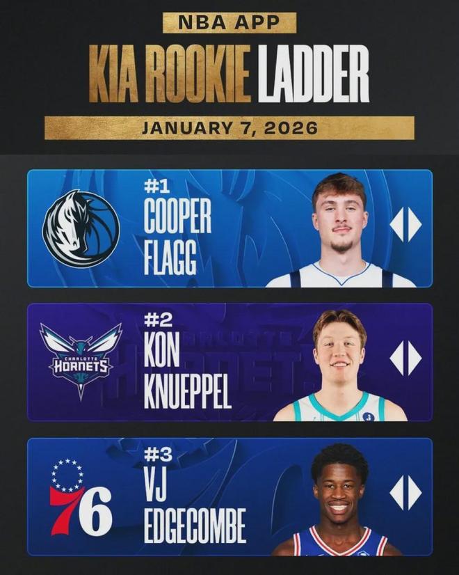 黄蜂4号秀克尼佩尔只打了18分钟,7投5中得到12分6篮板3抢断。最近5场比赛,克尼佩尔只有1场得分超过20。赛季场均得分跌至19.2分,依然略高于弗拉格(19.1)。最近一期官方新秀榜,前三位没有变化,弗拉格继续领跑。