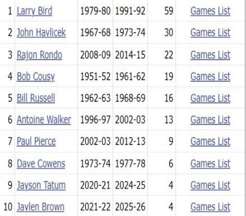 据统计,这是布朗生涯第5次斩获三双,超塔图姆,升至队史第9位。