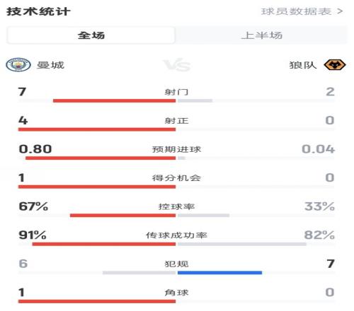 曼城半场20狼队数据:射门72,射正40,控球率67%33%